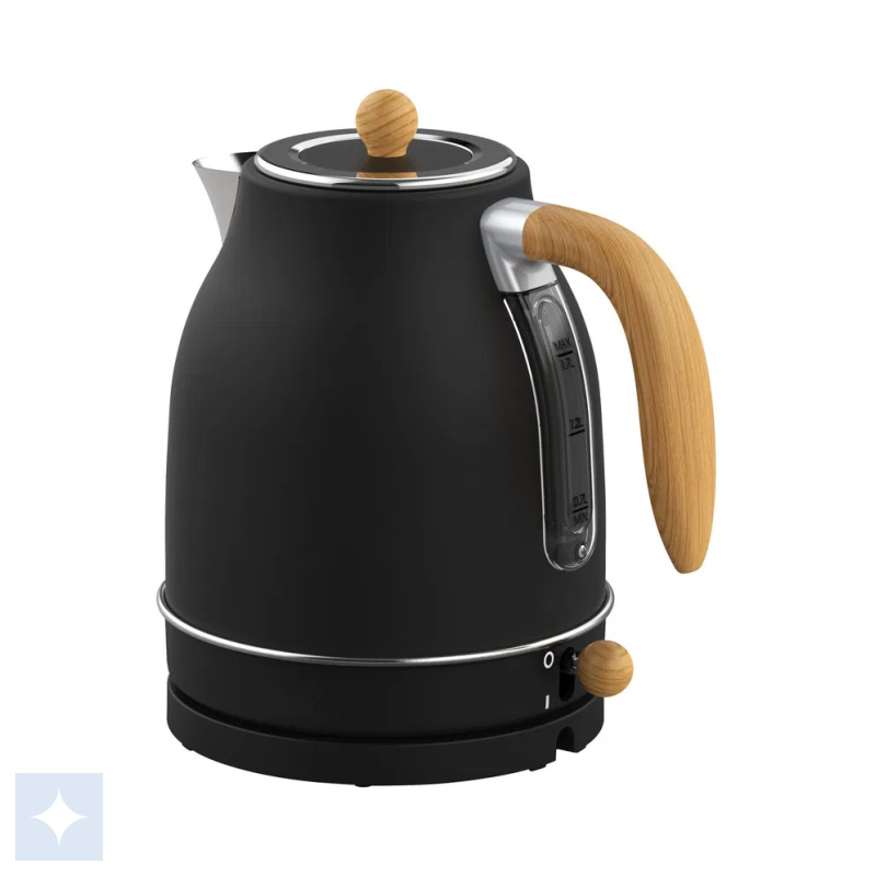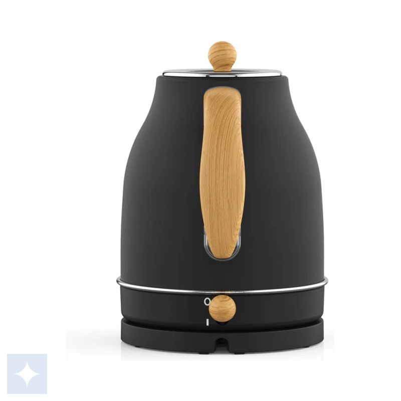 Witt Premium Wood Kettle, med en kapacitet på 1,7 liter, kombinerer et elegant sort design med trædetaljer for en stilfuld tilføjelse til køkkenet.