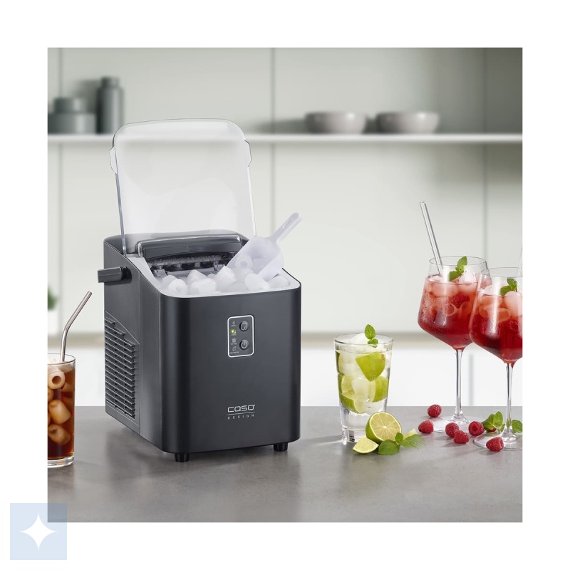 Få hurtigt friske isterninger med Caso isterningmaskine. Producerer 6–13 minutter pr. portion, op til 12 kg pr. døgn, med støjsvag drift (43 dB) og to størrelser isterninger.