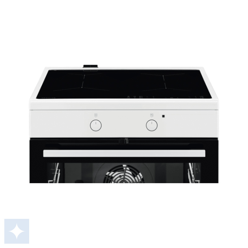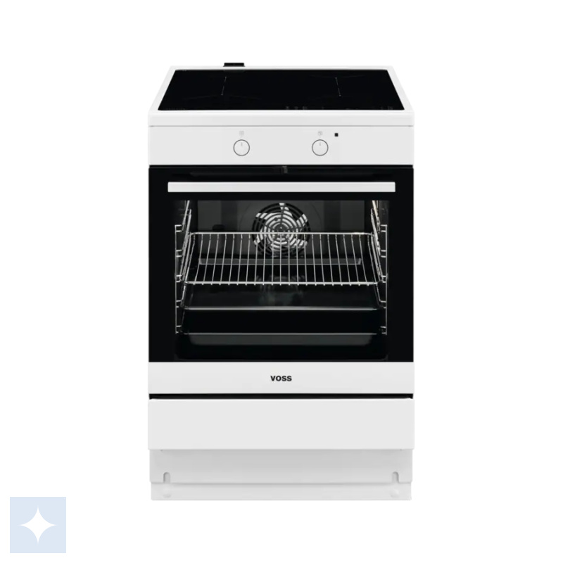 Voss induktionskomfur i hvid med 4 kogezoner og delvist selvrensende ovnrum med katalyse.