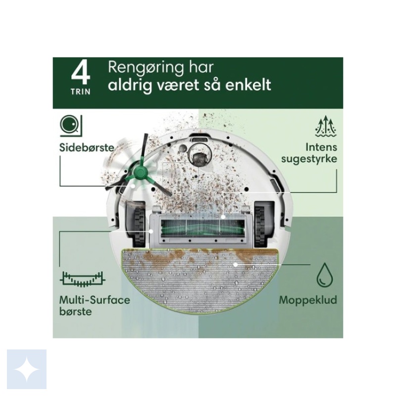 iRobot Roomba Combo 105 er en alsidig rengøringsrobot, der både støvsuger og vasker gulvet samtidig. Dens smarte navigation og tilpasselige rengøringstilstande sikrer effektiv og grundig rengøring, hvilket gør den perfekt til travle husholdninger.