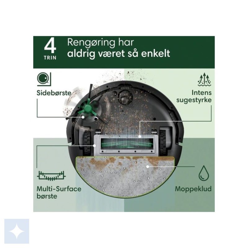 iRobot Roomba Combo 105 er en alsidig rengøringsrobot, der både støvsuger og vasker gulvet samtidig. Dens smarte navigation og kraftige sugeevne sikrer grundig rengøring på alle gulvtyper, mens dens kompakte design gør det nemt at nå ind i trange områder.