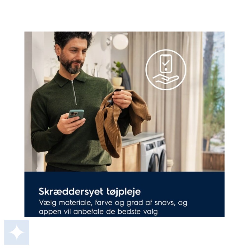 Få fuld kontrol over din tørretumbler med Electrolux appen, hvor du kan betjene maskinen eksternt, få statusopdateringer og modtage ressourcebesparende tips. Dette gør det muligt at tilpasse tørringsprocessen og holde styr på dit tøj uanset hvor du er.